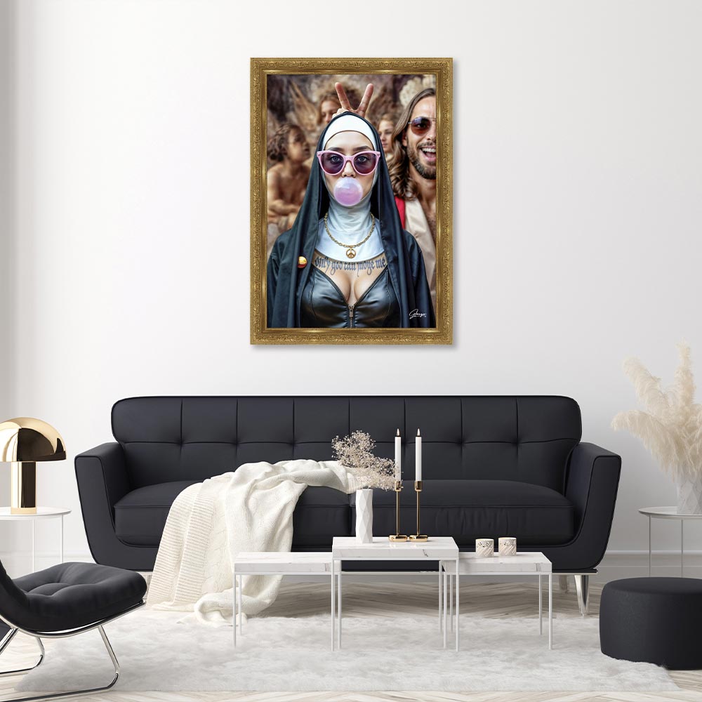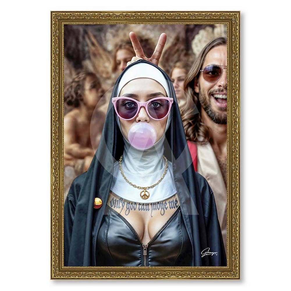 Cette décoration murale est une reproduction encadrée sans verre de l’artiste Alexandre Granger. Elle représente une nonne qui fait une bulle avec son chewing-gum. Elle porte des lunettes roses en forme de cœur et un collier en or avec le singe « Peace and Love ». Accompagnée d’un homme, en arrière plan, qui lui fait des oreilles de lapin avec ses doigts au-dessus de la tête.