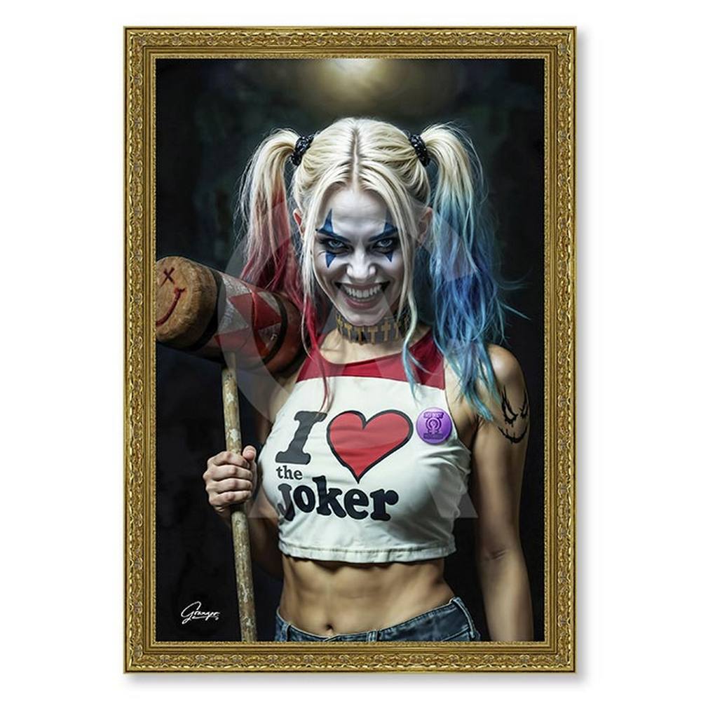 Cette décoration murale est une reproduction encadrée sans verre de l’artiste Alexandre Granger. Elle représente une fille, aux cheveux de couleurs bleu, rose et blanc, attachés en couettes. Elle porte un tee-shirt crop-top avec l’inscription « I LOVE THE JOKER ». Un clin d’œil à la célèbre anti-héroïne Harley Quinn.