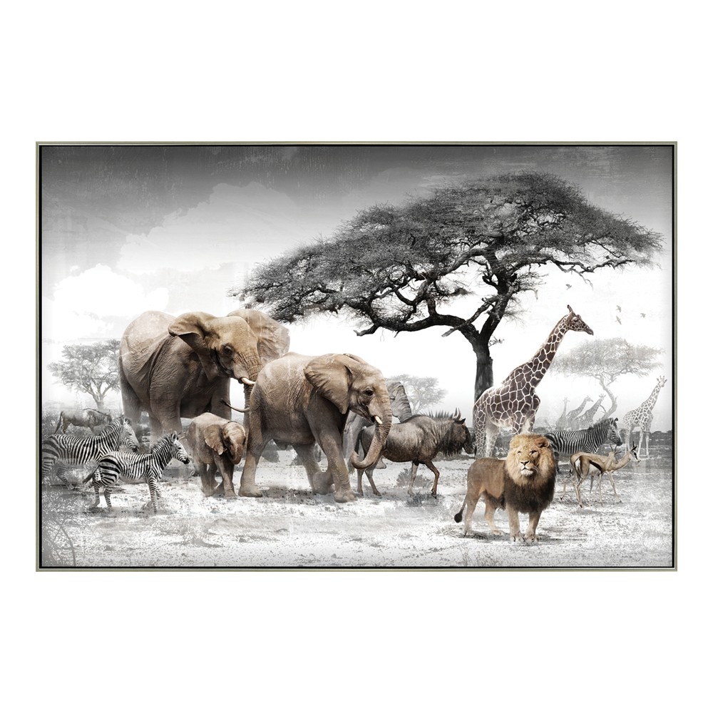 Toile Animaux de la Savane référence 03.3197 : Dimension visible de la toile : 80×120 cm & Dimension extérieure du cadre : 82.5×122.5 cm & Épaisseur sur le mur : 5.5 cm.